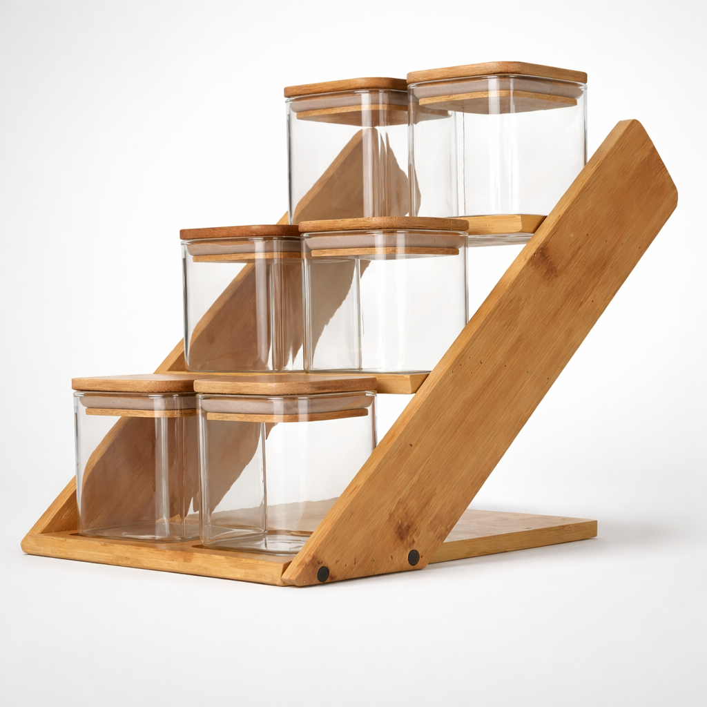 Étagère à Bocaux en Verre avec Support en Bois – Organisation Cuisine Élégante