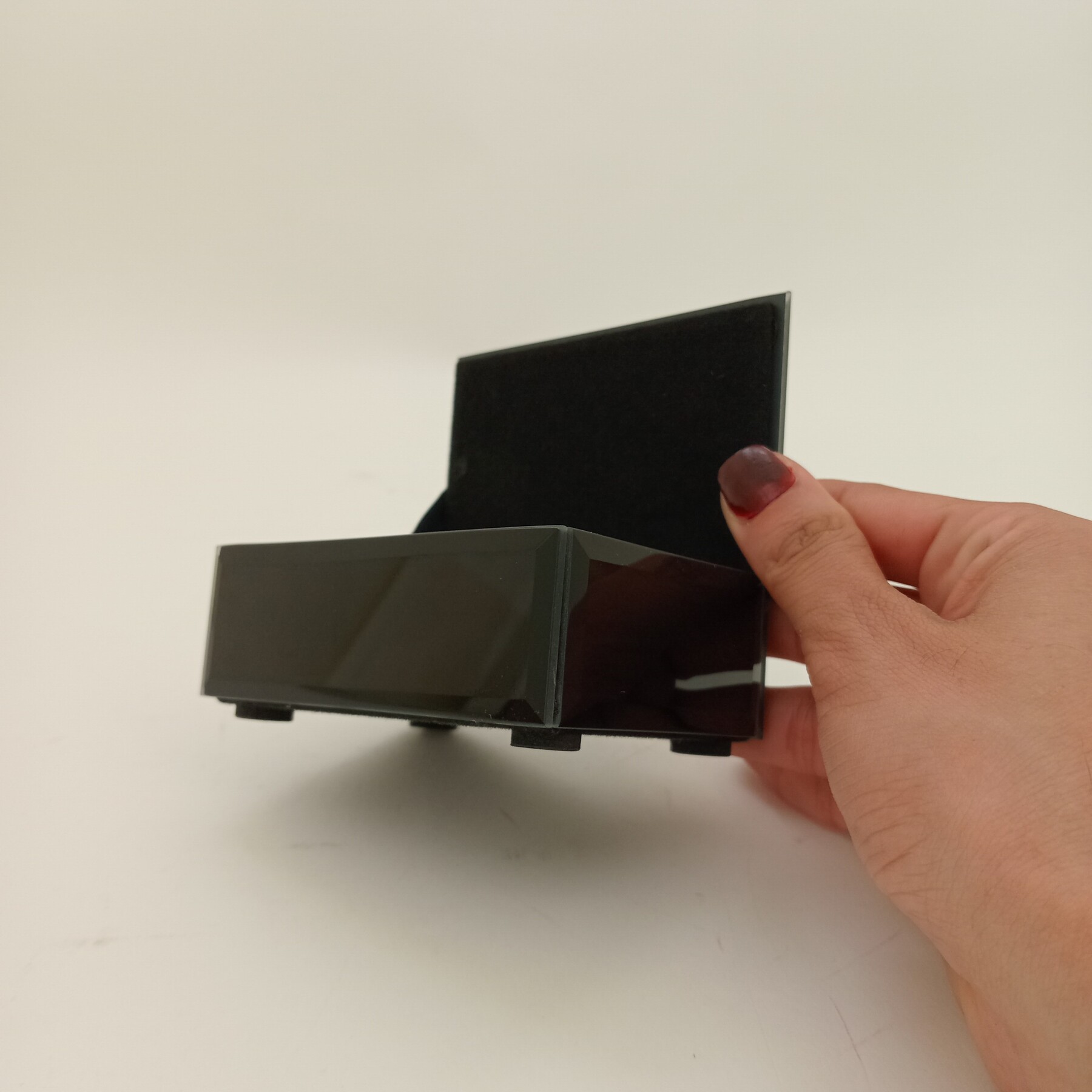 Cette boîte de rangement allie fonctionnalité et esthétique avec sa finition miroir noire. Agrémentée d’un bouton en cristal facetté, elle apporte une touche de raffinement discrète à tout intérieur.