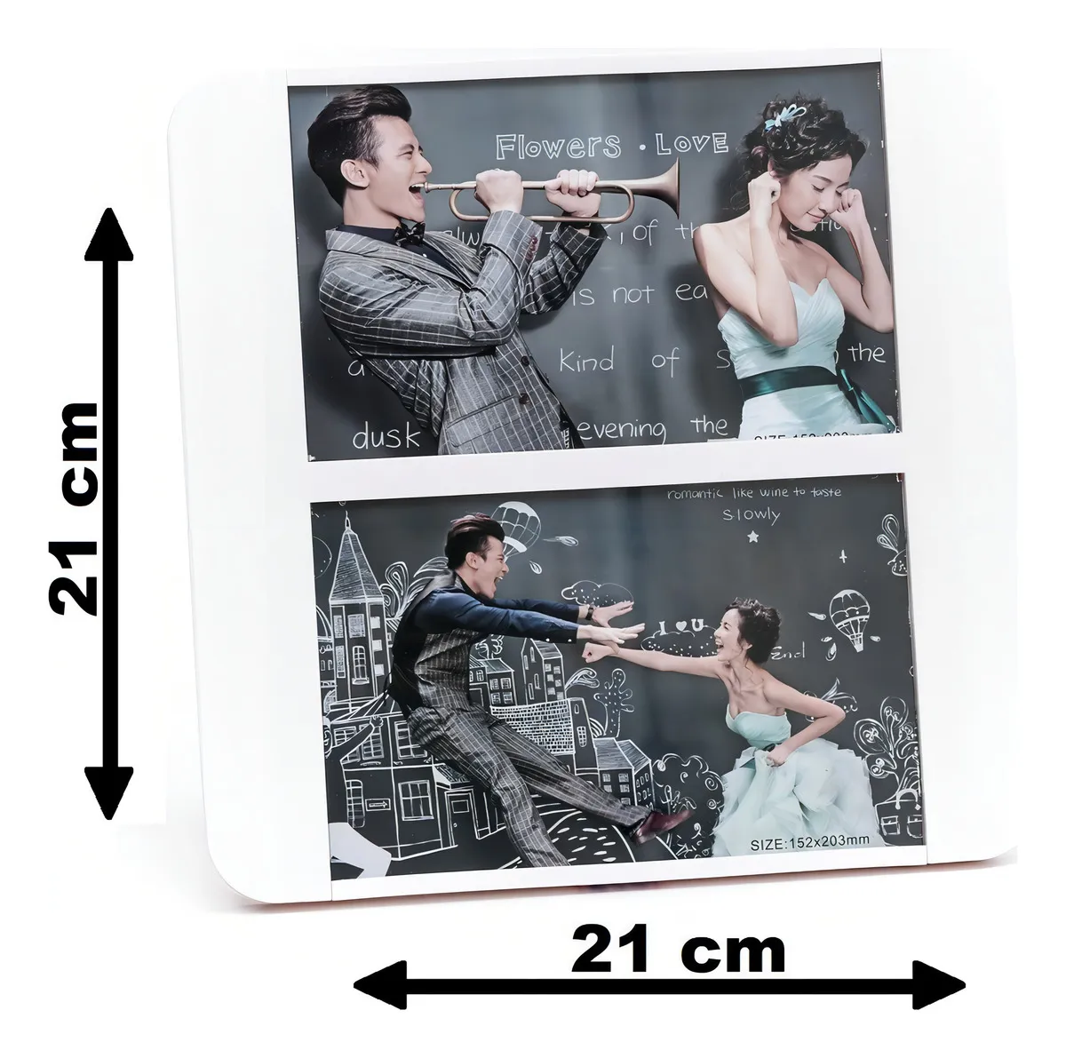 Son format équilibré (21 × 21 cm) permet de présenter deux photos de taille moyenne tout en gardant un aspect compact et esthétique.