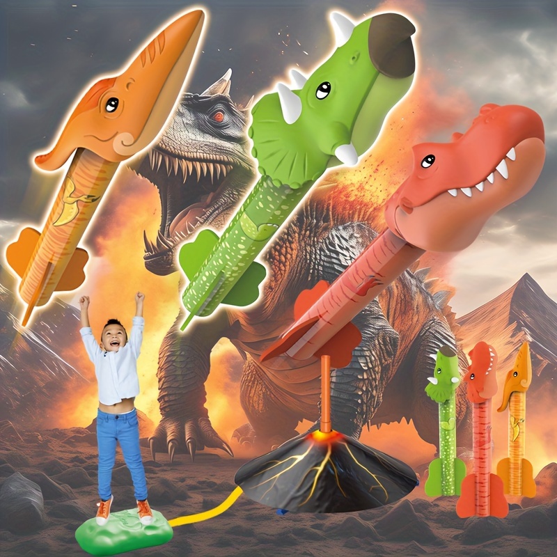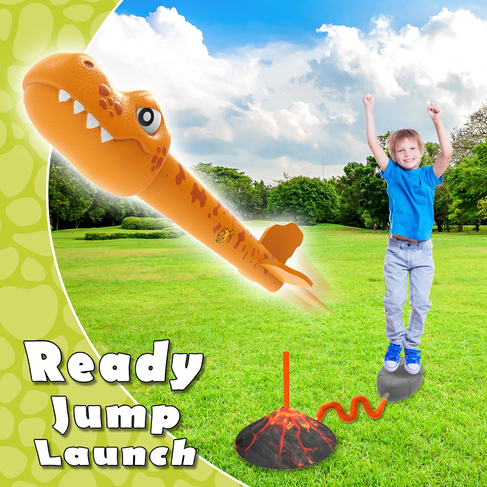 Un jouet d’extérieur super amusant où les enfants font décoller des fusées en forme de dinosaures jusqu’à 30 mètres de haut simplement en sautant dessus !