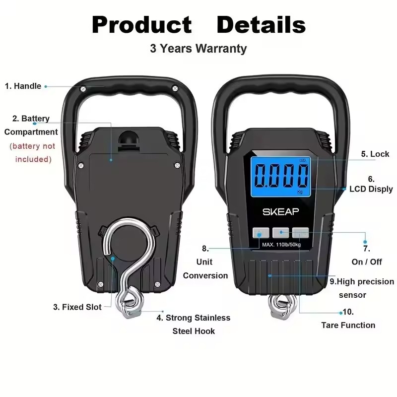Sa poignée ergonomique large et antidérapante offre une prise en main confortable, même lorsque vous soulevez des charges lourdes. L’écran LCD rétroéclairé en bleu garantit une lecture claire et immédiate du poids, que vous soyez en plein soleil ou dans un environnement sombre (idéal pour les sessions de pêche nocturnes ou les pesées rapides dans un garage peu éclairé). De plus, son crochet en acier inoxydable se range intelligemment au dos de l’appareil pour un gain de place optimal.
