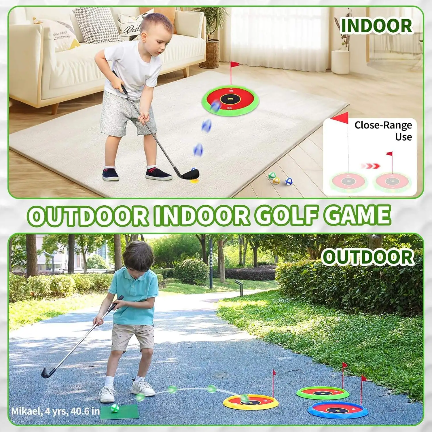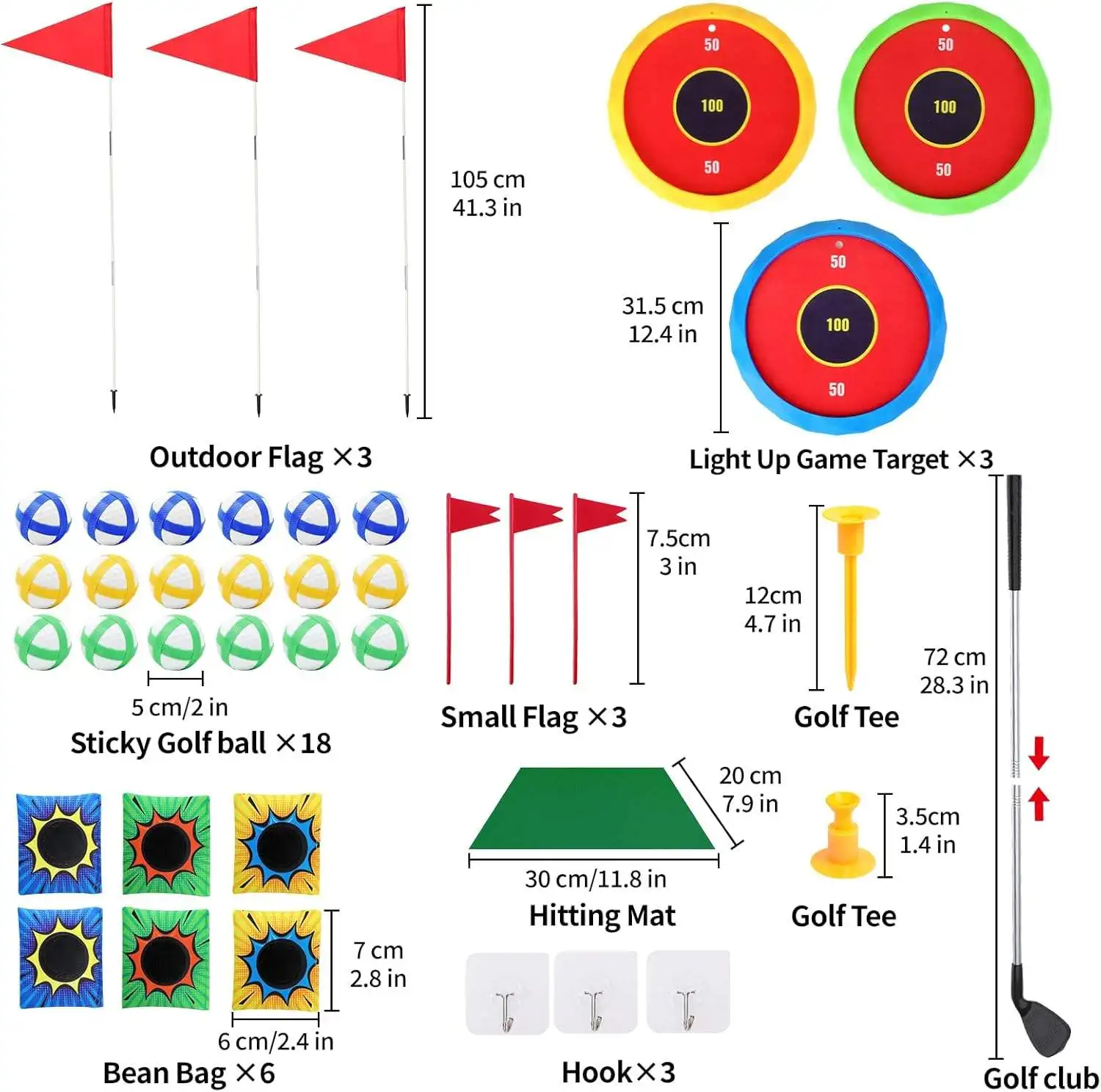 • Ensemble Complet Premium : Comprend un club de golf adapté, 18 balles adhésives (bleues, jaunes, vertes), 6 sacs de haricots, 3 grandes drapeaux, 3 petites drapeaux, 2 tees de golf, un tapis de frappe et des crochets de fixation.