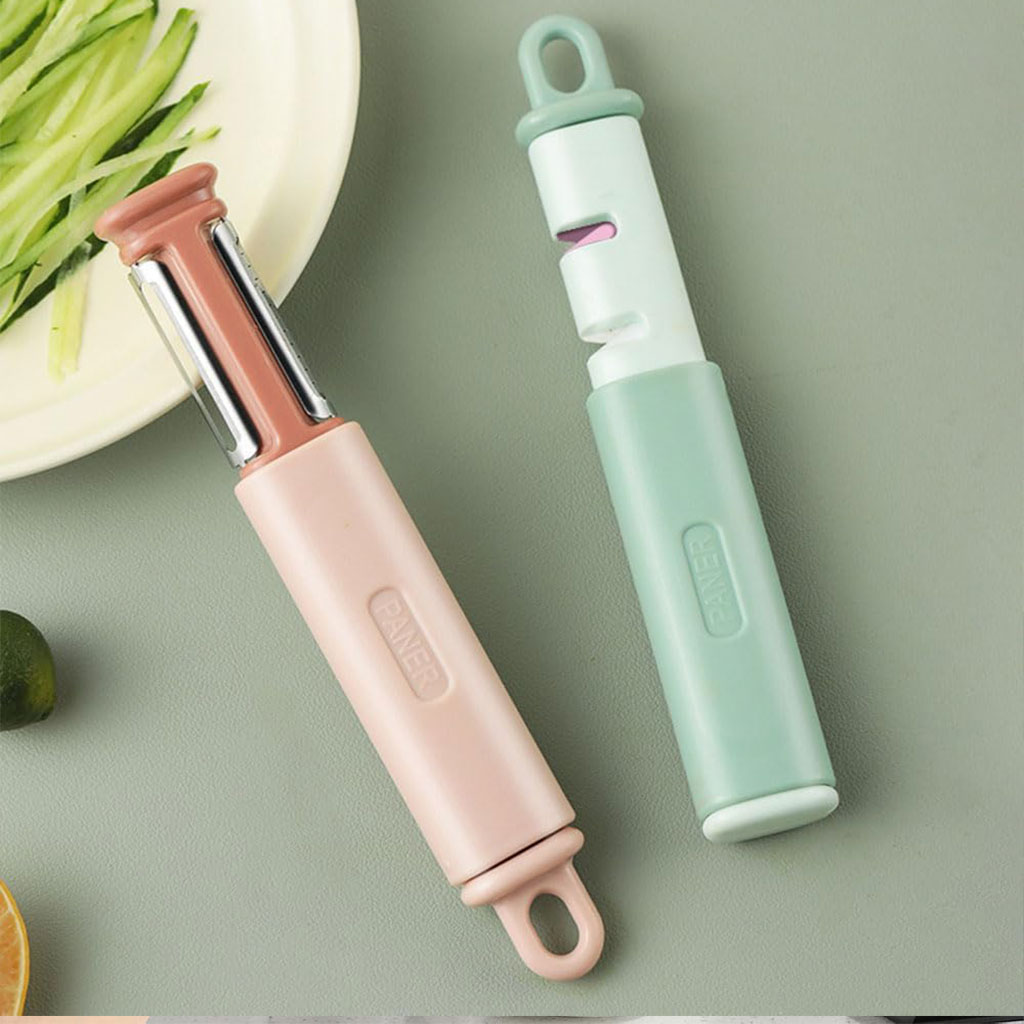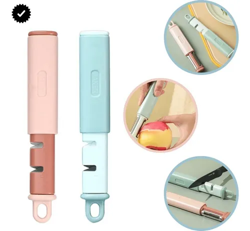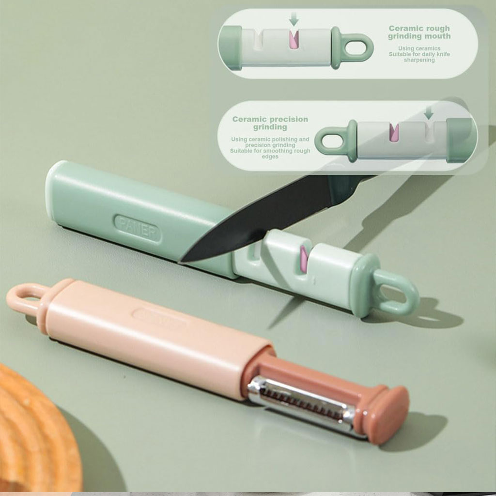 Simplifiez toutes vos préparations en cuisine avec cet éplucheur multifonction 2-en-1, combinant éplucheur de fruits et légumes et aiguiseur de couteaux intégré dans un seul accessoire pratique et compact.