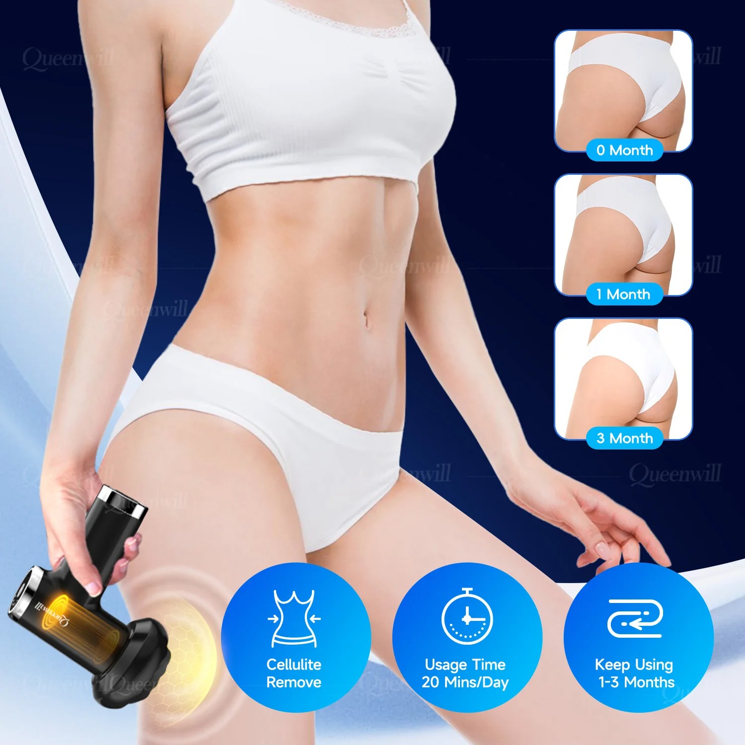 L’utilisation est un jeu d’enfant grâce à son bouton unique. Pour une séance efficace, commencez toujours par le niveau de vitesse le plus bas et augmentez progressivement selon votre ressenti. Utilisez la tête “Vague” ou le filet de protection si vous l’utilisez sur des zones sensibles ou pour un massage anti-cellulite sur les cuisses et les fessiers (résultats visibles après 1 à 3 mois d’utilisation régulière).