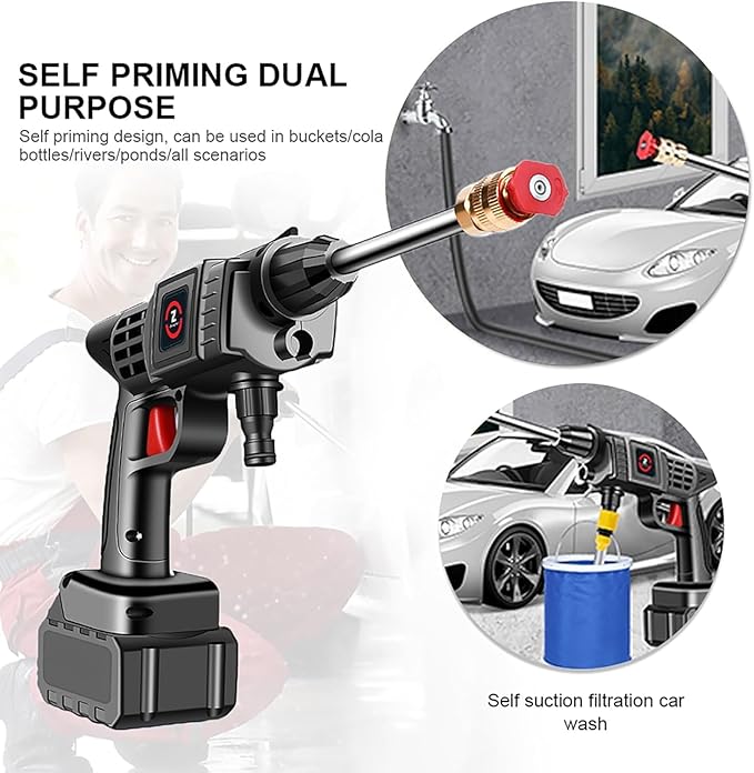Profitez d’un nettoyage efficace et sans contraintes avec ce nettoyeur haute pression sans fil, équipé de 3 batteries 48V pour une autonomie prolongée. Idéal pour le lavage des voitures, motos, terrasses, fenêtres et autres surfaces, il fonctionne avec une aspiration autonome, vous permettant d’utiliser n’importe quelle source d’eau : seau, bouteille, rivière, etc.