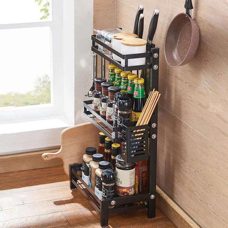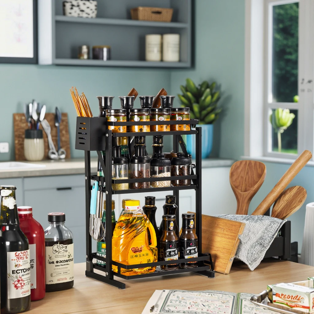 Sa capacité de stockage est impressionnante : les deux niveaux spacieux accueillent aisément vos bouteilles hautes (huile, vinaigre) et vos bocaux à épices. Mais ce sont les accessoires intégrés qui font la différence : un porte-couteaux sécurisé, un compartiment pour vos couverts ou baguettes, un support latéral dédié à votre planche à découper et des crochets mobiles pour suspendre louches et spatules. Tout est à portée de main, transformant la préparation des repas en un moment fluide et agréable.