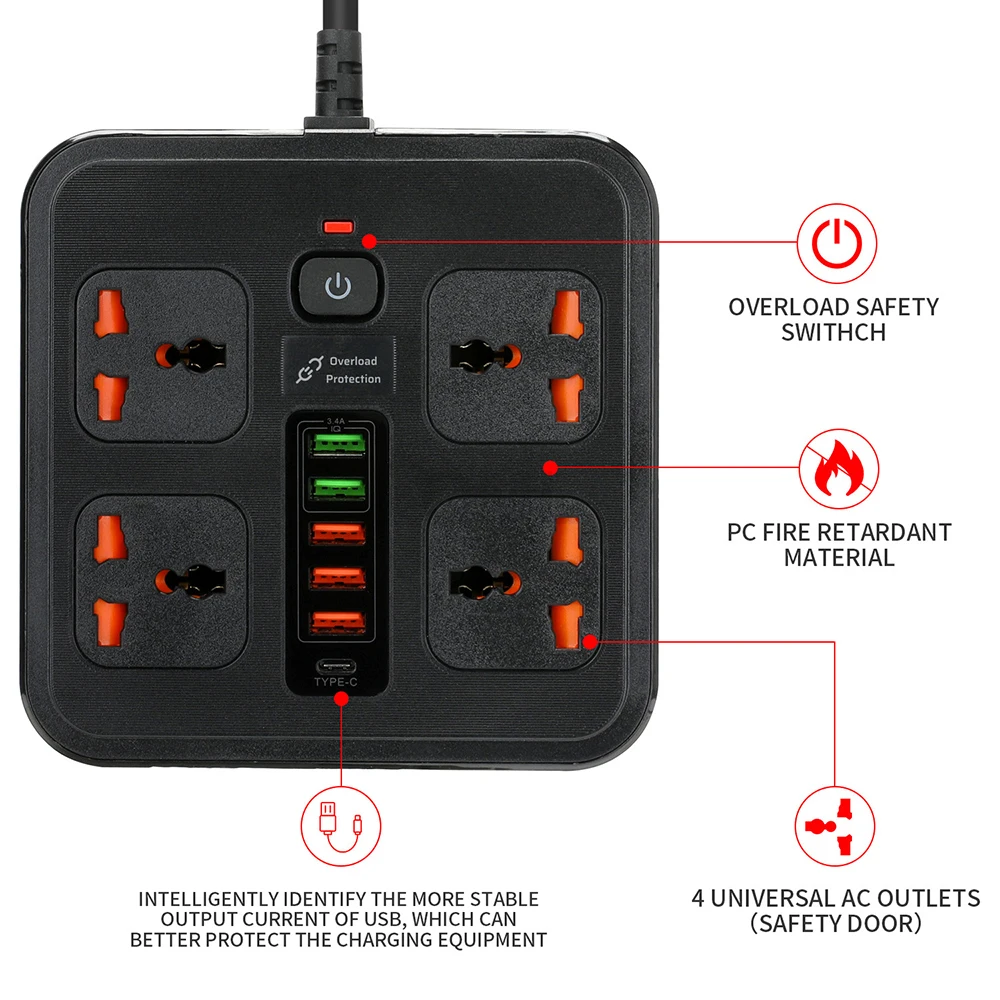 • Polyvalence Totale : Équipée de 4 prises de courant universelles, elle accepte la majorité des fiches du marché sans adaptateur supplémentaire. Idéal si vous avez des appareils importés ou des chargeurs de différents formats.
