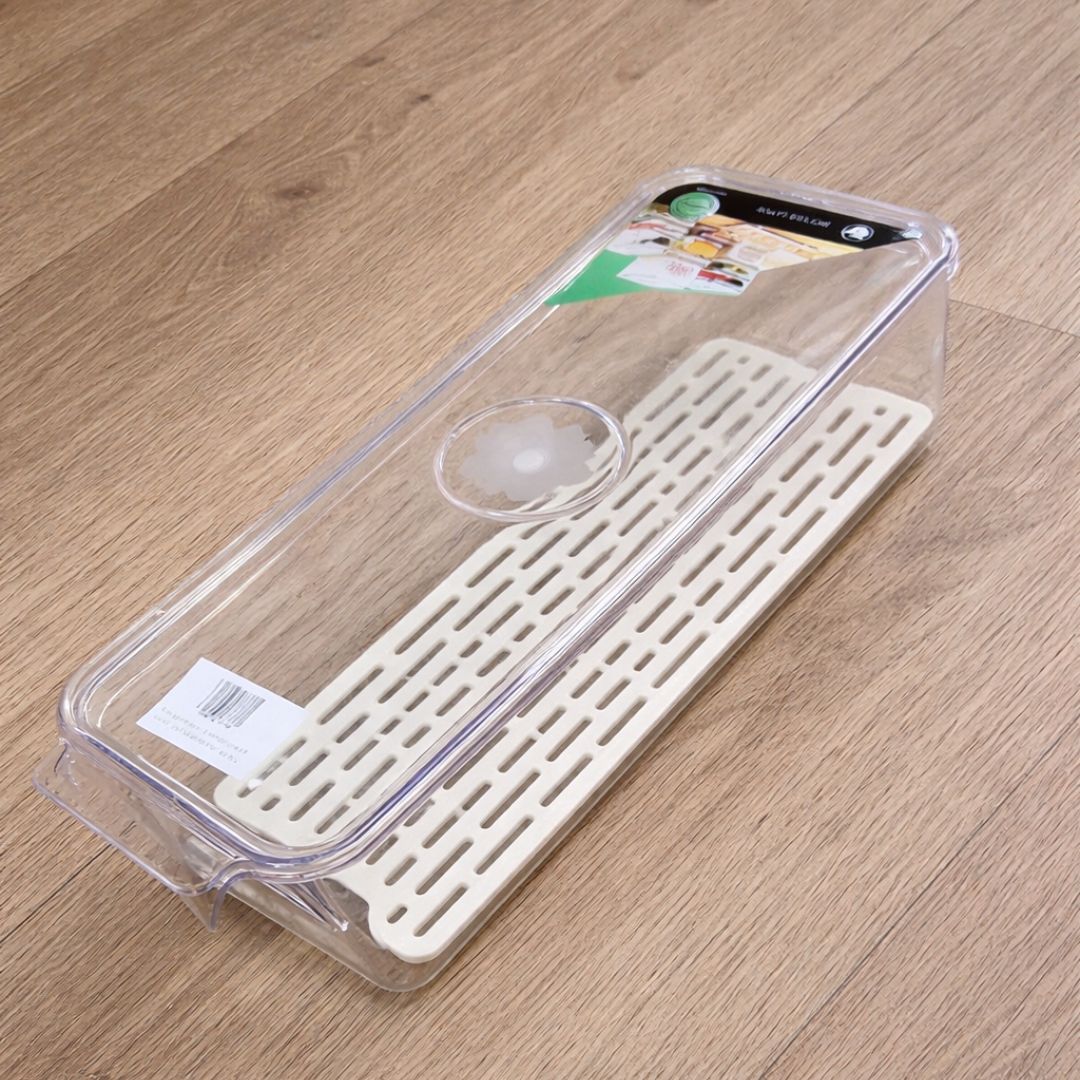 Grâce à son format long et fin (31 × 11 × 7 cm), il se glisse facilement sur les étagères du réfrigérateur sans encombrer l’espace. La grille d’égouttage amovible permet à l’eau de s’écouler après lavage, évitant l’humidité stagnante et prolongeant la fraîcheur des aliments.