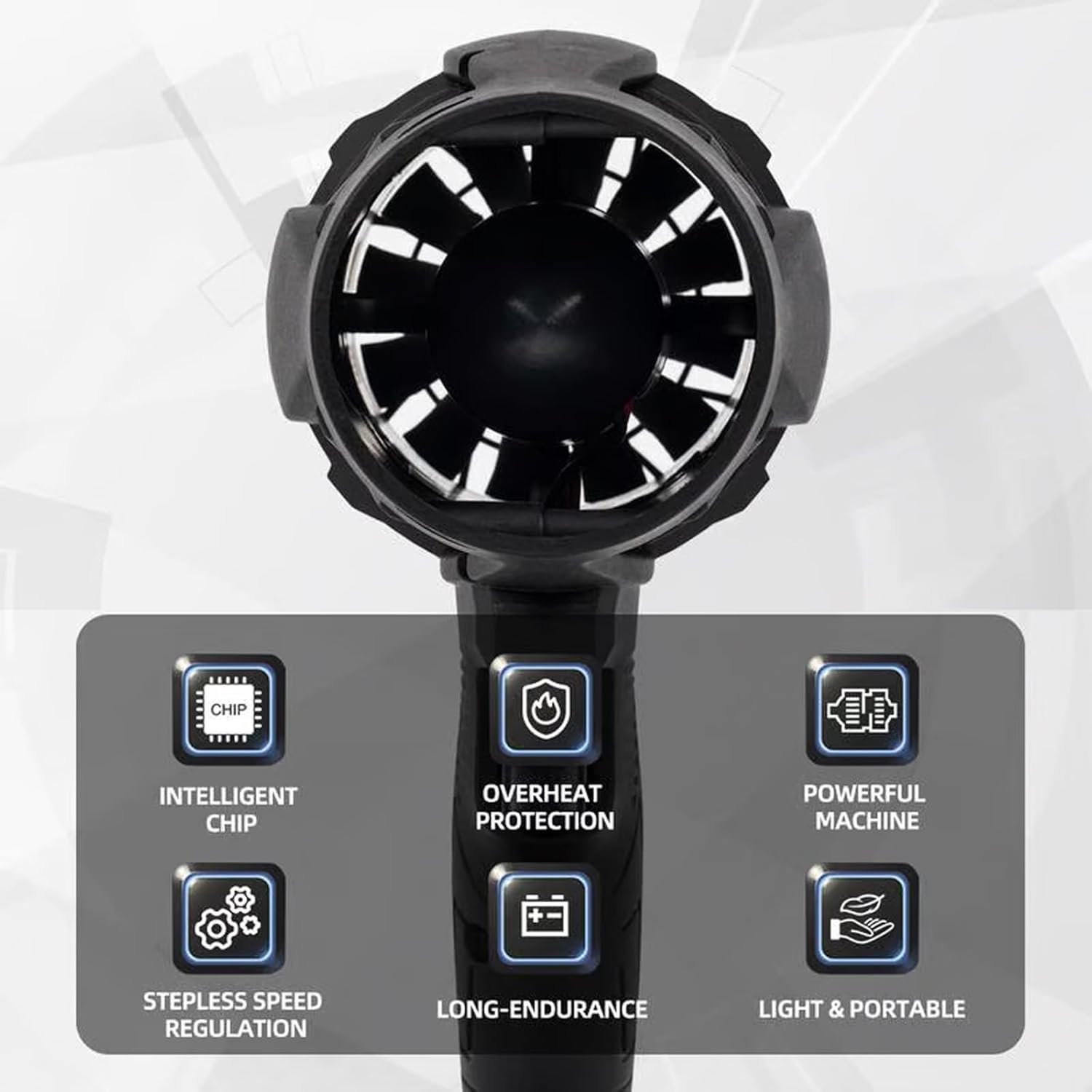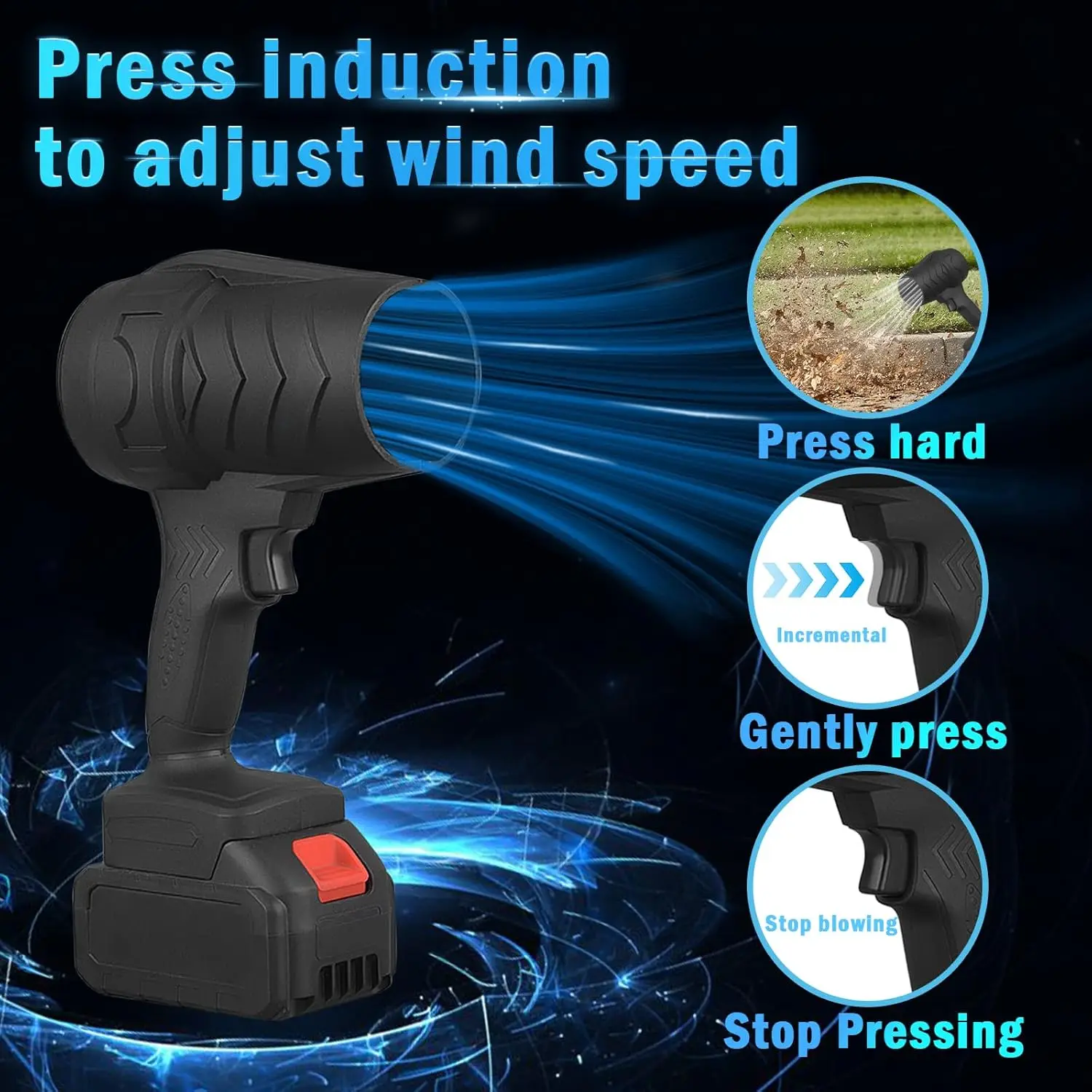 Ajustez la vitesse du vent facilement en appuyant plus ou moins fort sur la gâchette : puissance variable en fonction de la pression exercée.