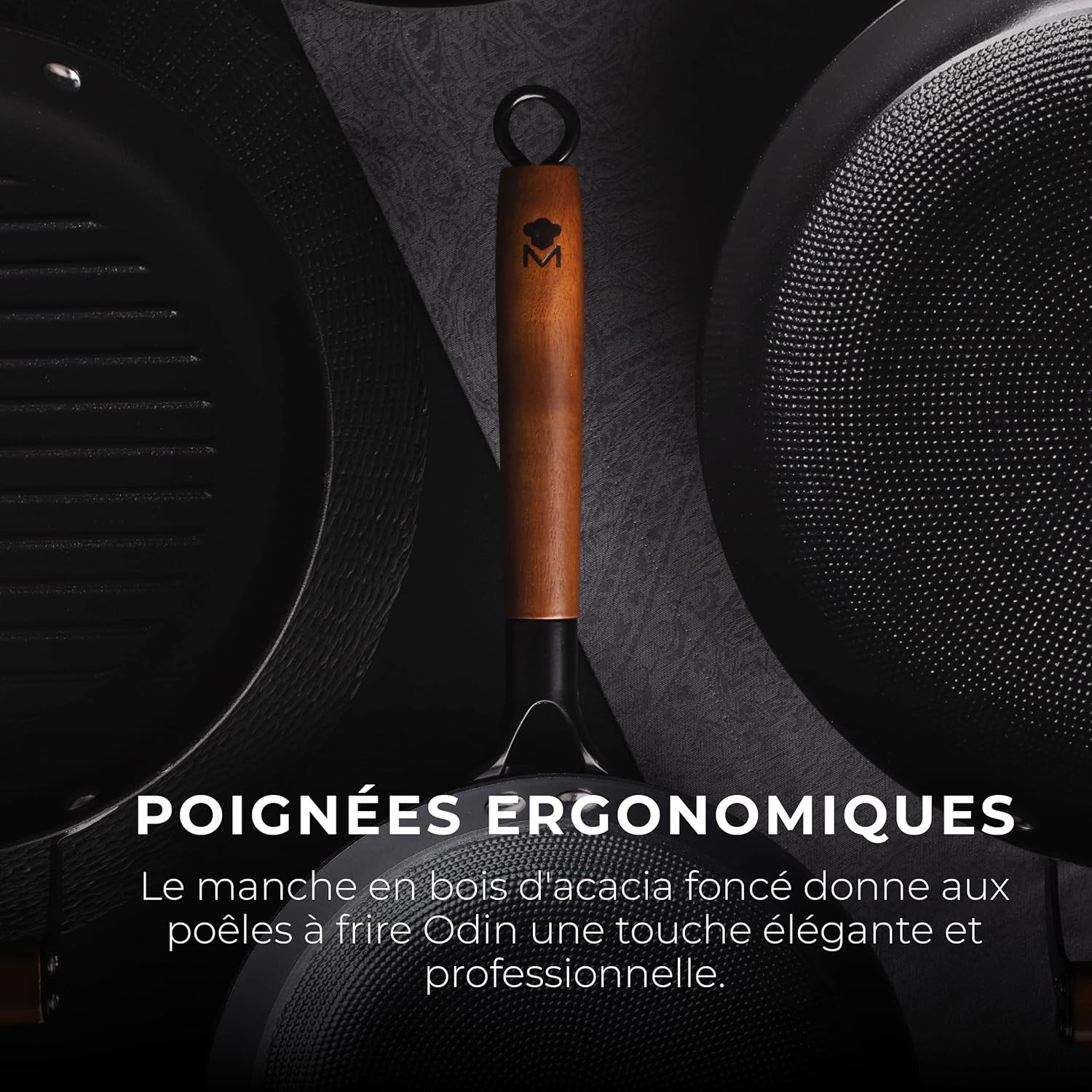 • Poignée ergonomique en bois d’acacia foncé pour un style élégant et une prise en main confortable