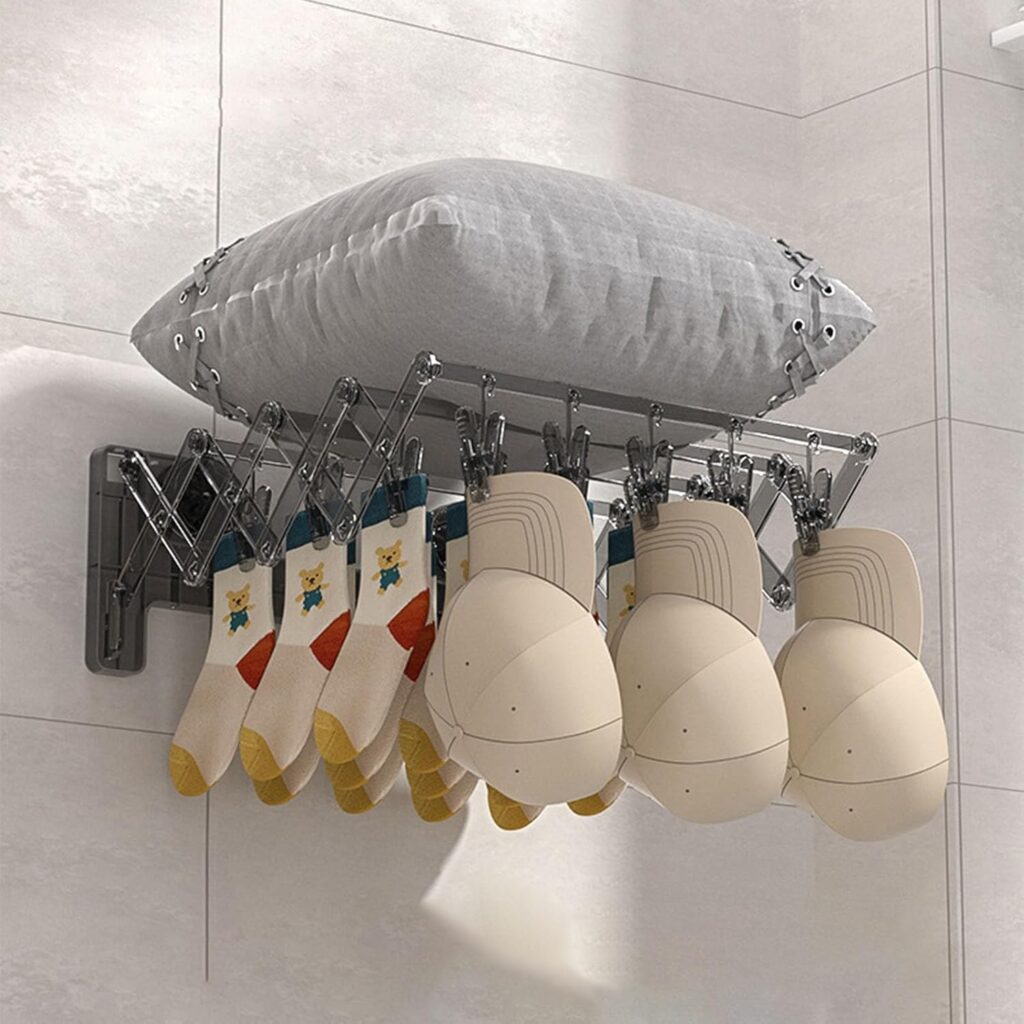 Étendoir Mural Pliable avec 20 Pinces – Support de Séchage Gain de Place pour Chaussettes, Sous-vêtements et Casquettes